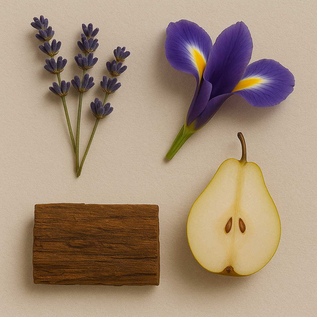 De geur opent met een kalme frisheid van lavendel, waarna direct het hart tot leven komt met fluweelzachte iris, warme ambrette (muskuszaad) en een subtiele fruitige hint van peer. Deze combinatie geeft de geur zijn iconische, poederige elegantie.
