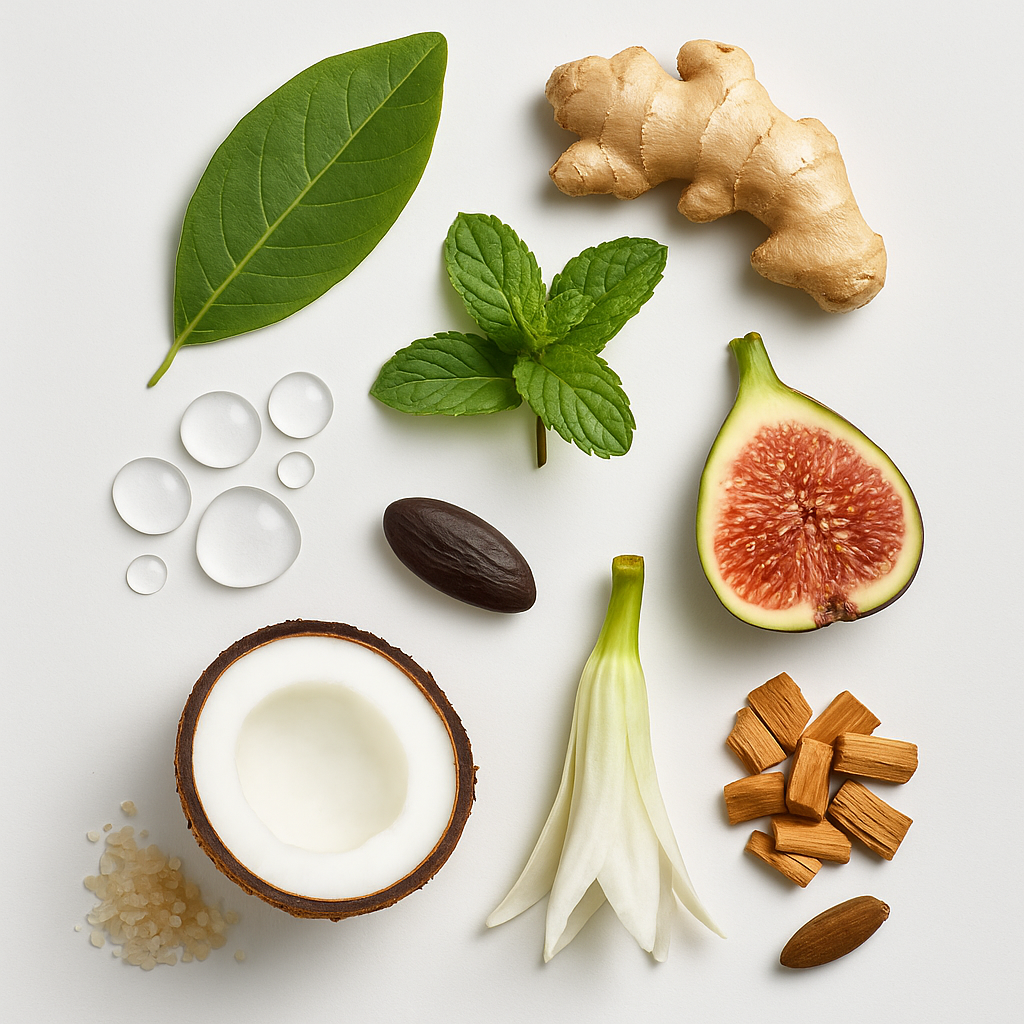 Een geur die je meeneemt naar een verborgen oase van groen, zon en luxe. De opening laat zich voelen als een fris briesje van munt en gember dat door overhangende bladeren strijkt, gevolgd door de zachte stroom van kokoswater en rijpe vijg in het hart subtiel gezouten alsof je de zon kust op het strand. De basis omhult je vervolgens met sensueel sandelhout en tonkaboon, waardoor de geur blijft hangen als een warme herinnering aan zomerse dagen en verdwaalde tropische tuinen.