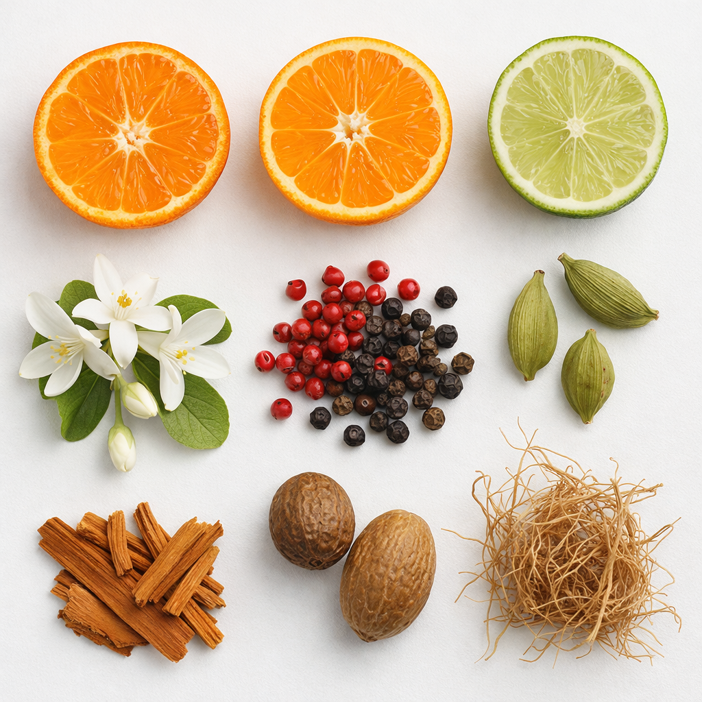 Neroli, roze peper, zwarte peper, nootmuskaat, kardemom