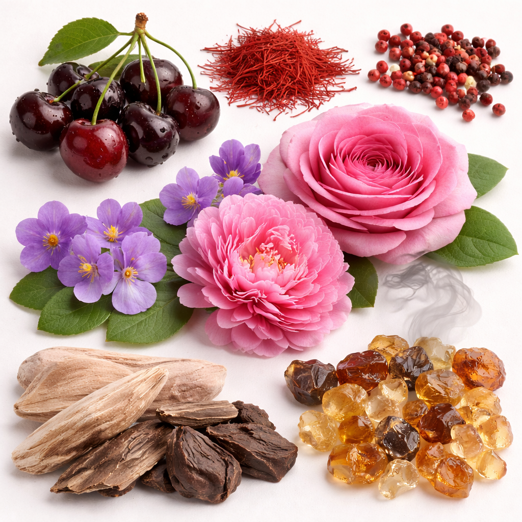 Een verfijnde en elegante geur die kracht, diepte en verfijning perfect balanceert. De opening verwelkomt je met een rijk akkoord van zwarte kers, saffraan en roze peper, wat zorgt voor een warme, fruitige en pittige eerste indruk. In het hart ontvouwt zich een bloemige harmonie van roos de Mai, viooltje, pioenroos en cashmere-hout, wat de geur een zachte, verfijnde en luxueuze charme geeft. De basis van wierook, mirre, amber en muskus zorgt voor een diepe, romige en langdurige finish die elegant blijft hangen en een onuitwisbare indruk achterlaat.